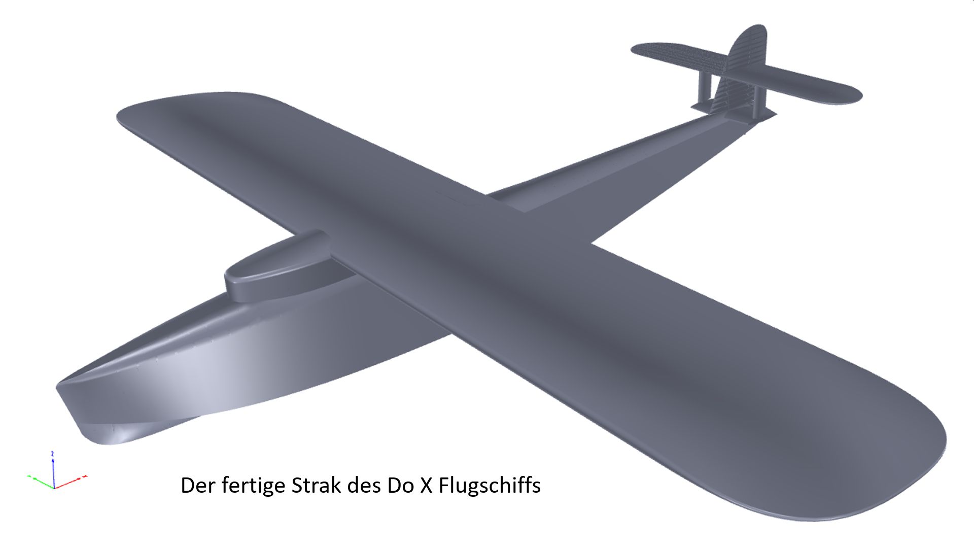 Um die äußere Hülle der Do X möglichst realistisch zu modellieren wurden eine Vielzahl von unterschiedlichsten Informationen in einem CAD System zueinander in Relation gesetzt. Diese Informationen waren Originalzeichnungen mit Dreiseitenansichten der Do X, Innenansichten sowie hochauflösende Bilder von Spanten und Strukturkomponenten aus der Bauphase des Flugschiffs.